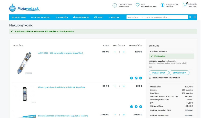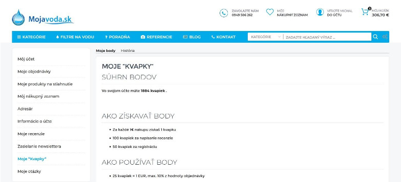 Pripočítanie bodov získaných prostredníctvom nákupu na e-shope www.mojavoda.sk nastáva po potvrdení odoslania objednaného tovaru. Odmenové body sú pripísané na Váš účet, a zároveň sú po dobu 14 dní zablokované pre ich uplatnenie, z dôvodu prípadného využitia práva na odstúpenie od zmluvy alebo práva na vrátenie tovaru. Po uplynutí tejto lehoty budú odmenové body "kvapky" odblokované a bude možné ich uplatniť. Pokiaľ si uplatníte právo na odstúpenie od zmluvy alebo právo na vrátenie tovaru, budú takto získané body stornované.