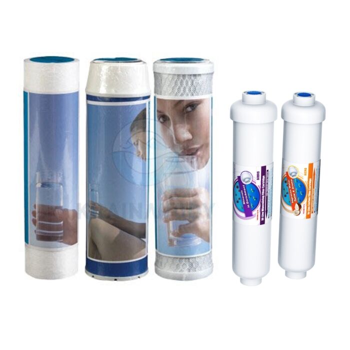 Univerzálna sada filtračných vložiek do domácej reverznej osmózy. Obsahuje kvalitnejšie 10" filtračné vložky do 3 spodných filtračných telies, ako aj 2 post-filtre umiestnené za osmotickým filtrom.