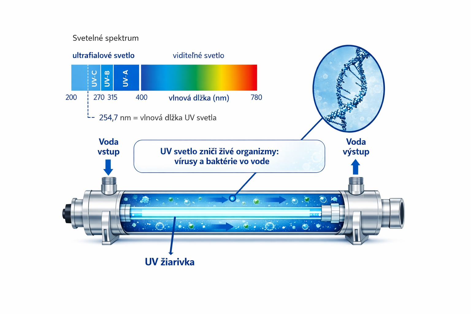 UV lampa CrystalUV® 55W predstavuje moderný a ekologický spôsob dezinfekcie pitnej vody pre menšie domácnosti. Využíva UV-C žiarenie, ktoré spoľahlivo likviduje baktérie, vírusy, cysty a ďalšie mikroorganizmy s účinnosťou až 99,98 %. Ultrafialové svetlo narúša DNA mikroorganizmov, čím im zabraňuje ďalej sa množiť a spôsobovať zdravotné riziká.